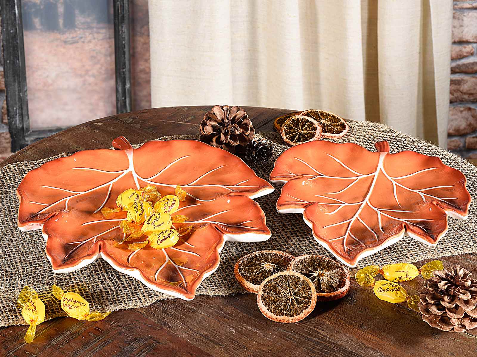 Platos/bandejas decorativos de hojas de arce otoñales con decoraciones en relieve en un juego de dos