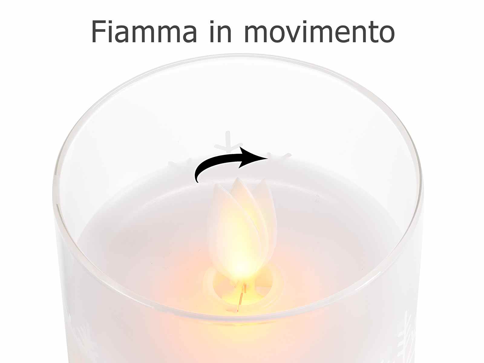 Media: Ø 7,5 x 12,5 H - Piccola: Ø 7,5 x 10 H - Funziona con 2 pile stilo non incluse - Con vetro decorato con fiocchi di neve