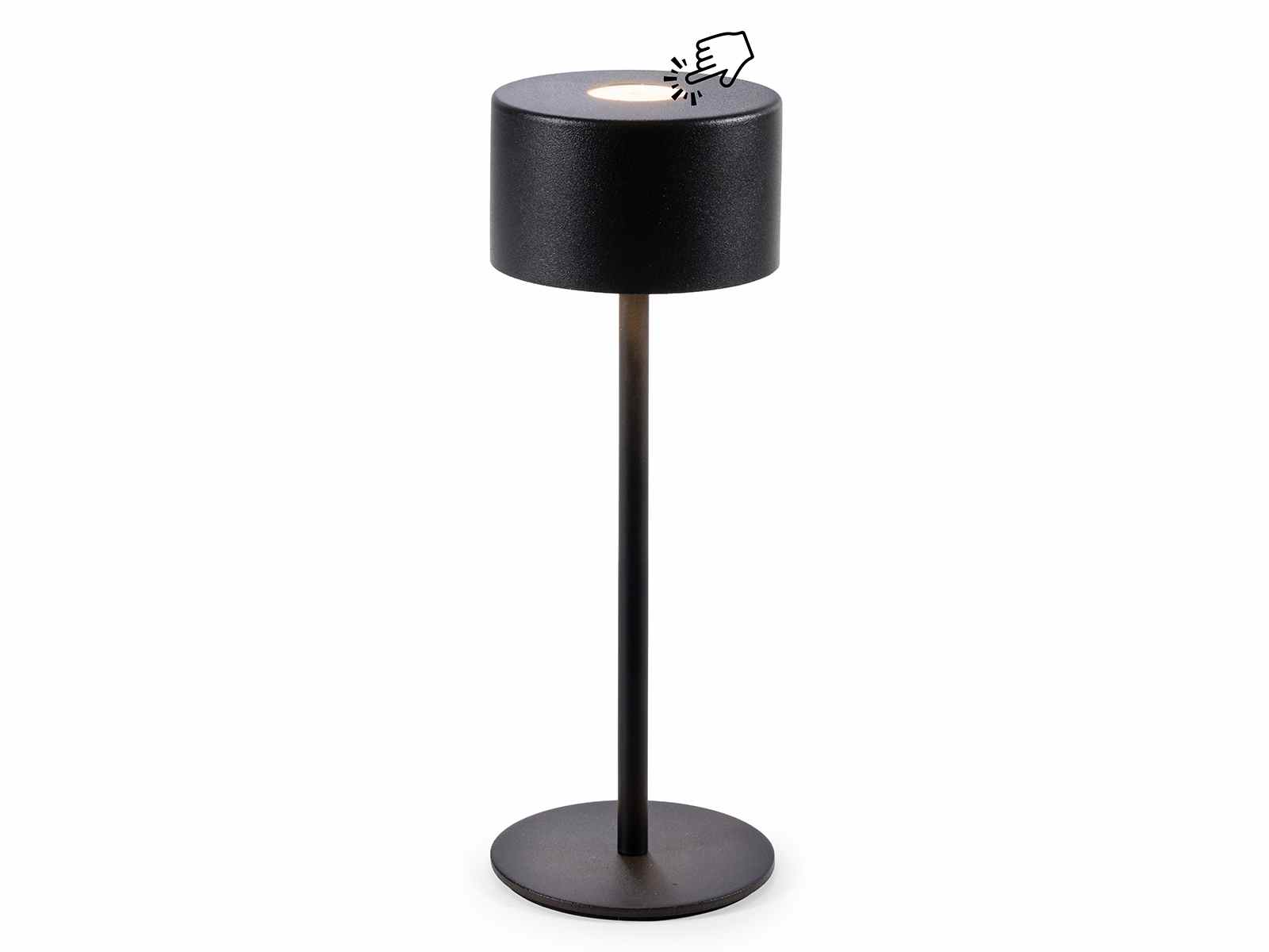Lámpara de mesa metálica con luz LED, activada por tacto y recargada mediante el cable USB incluido. Ofrece de 9 a 10 horas de batería. Cuenta con tres niveles de intensidad, ajustables con solo pulsar un botón