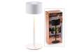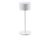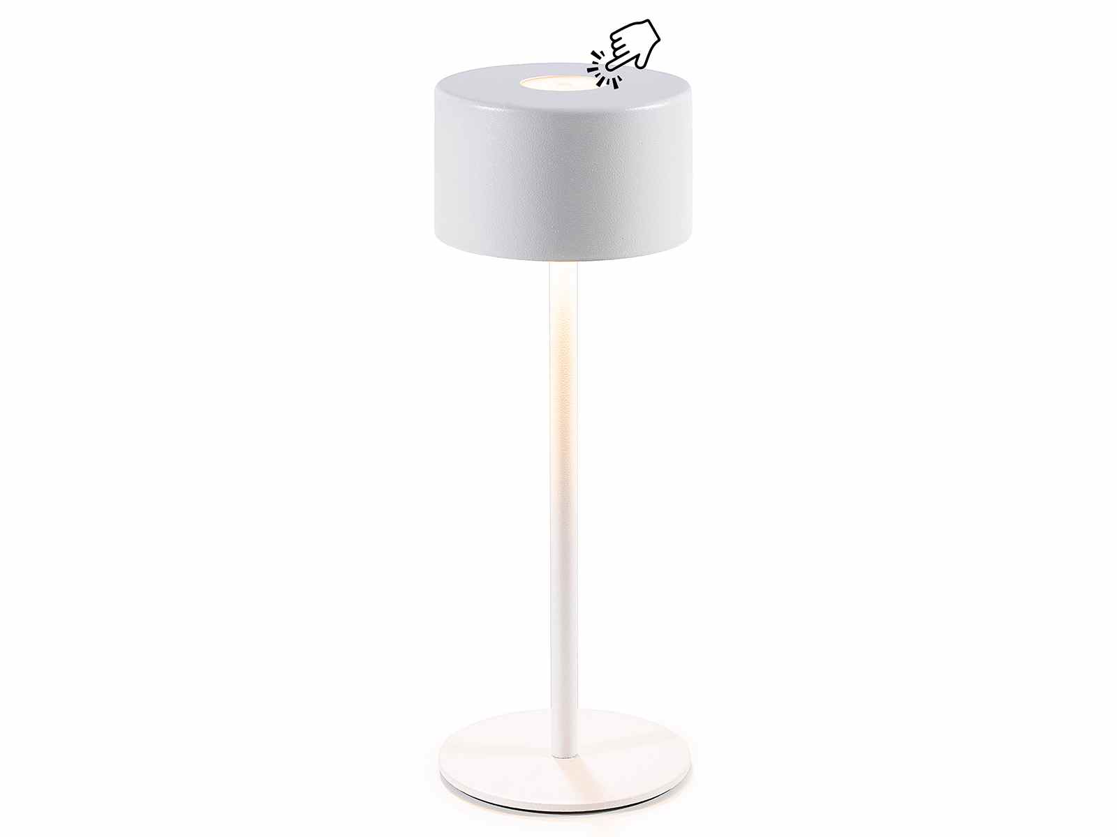 Lámpara de mesa de metal blanco con luz LED, activada por tacto y recargada mediante el cable USB incluido. Ofrece de 9 a 10 horas de batería. Cuenta con 3 niveles de intensidad ajustables con un toque. Ideal para uso en interiores y exteriores
