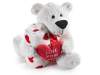 Ositos de peluche blancos sentados para el Día de San Valentín con un corazón rojo de peluche con la inscripción "¡Te amo!" en blanco y una suave manta de poliéster blanca con corazones rojos.
