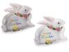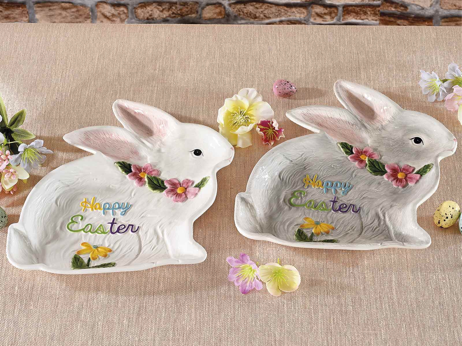 Platos decorativos de cerámica para Pascua en forma de conejito con decoraciones florales de colores en relieve y la inscripción "Feliz Pascua".