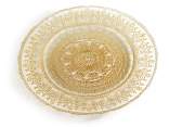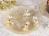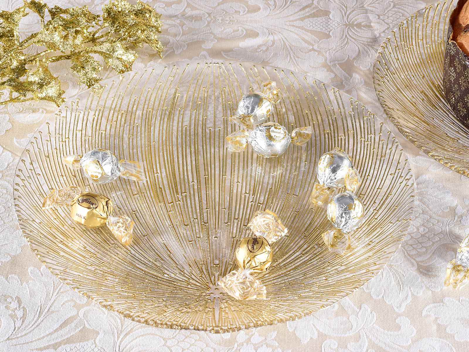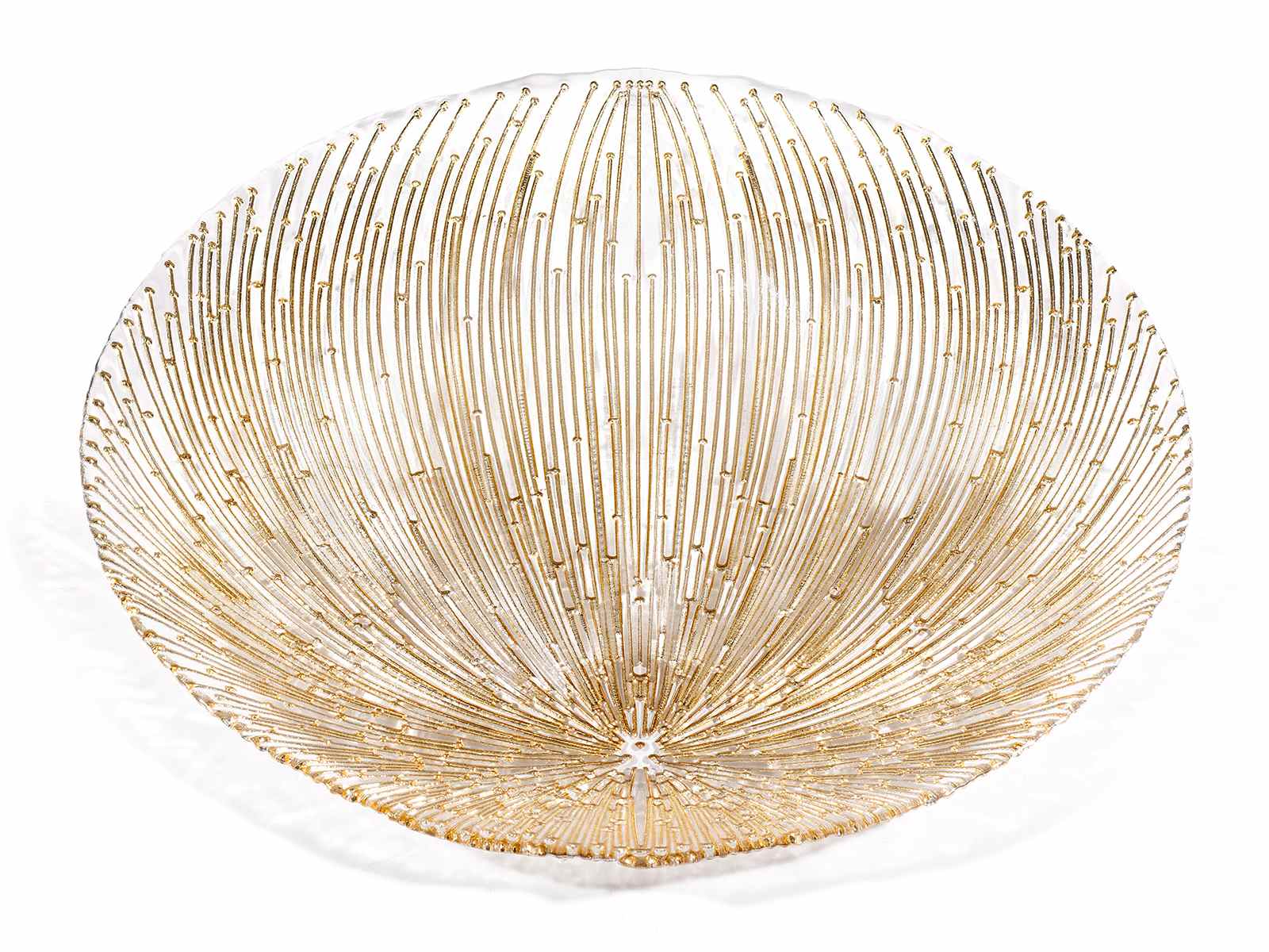 Platos redondos de vidrio comestibles con decoración de cascada dorada.