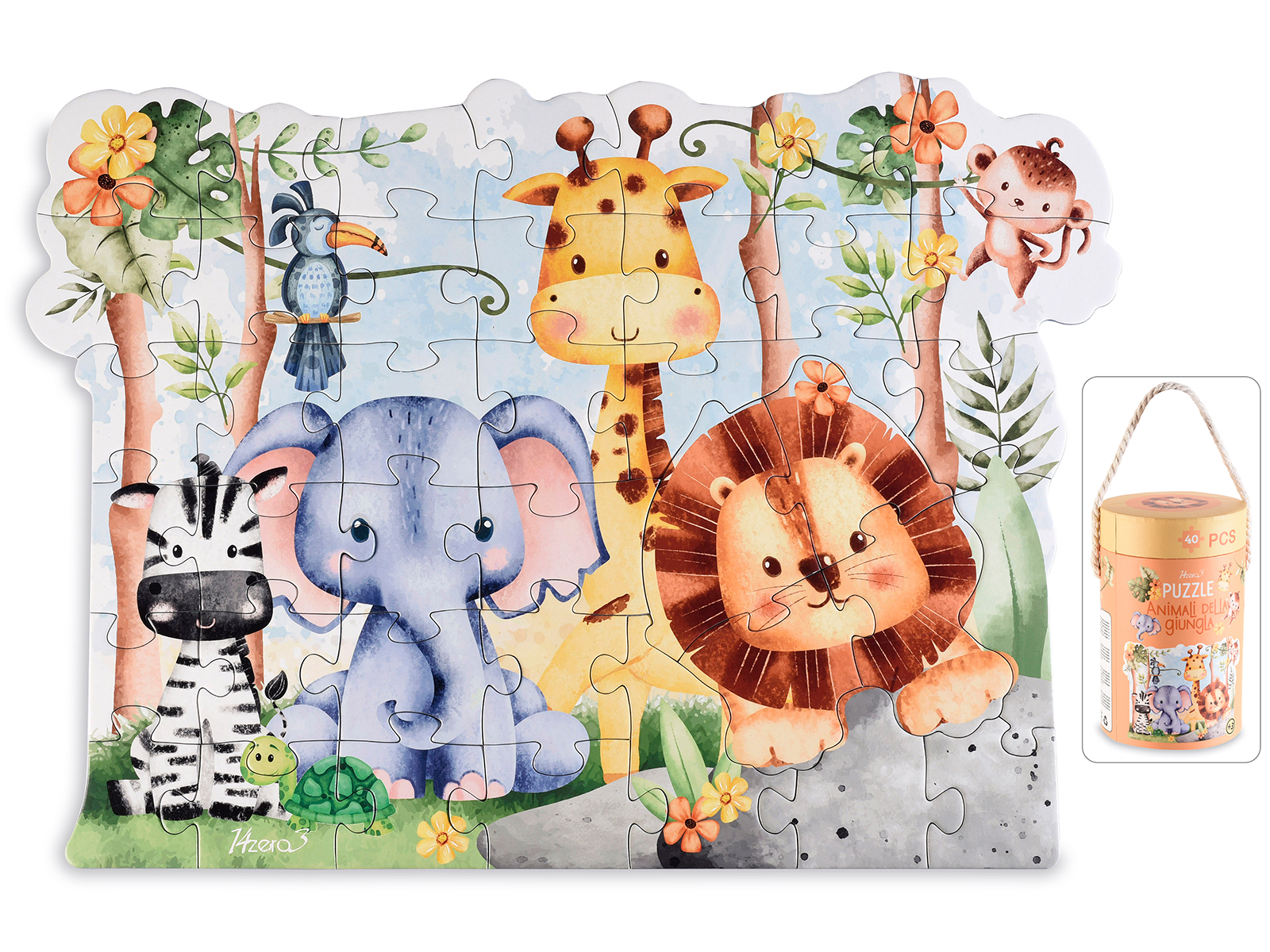 Puzzle de animales de cartón de 40 piezas para niños en caja cilíndrica con asa +3 años