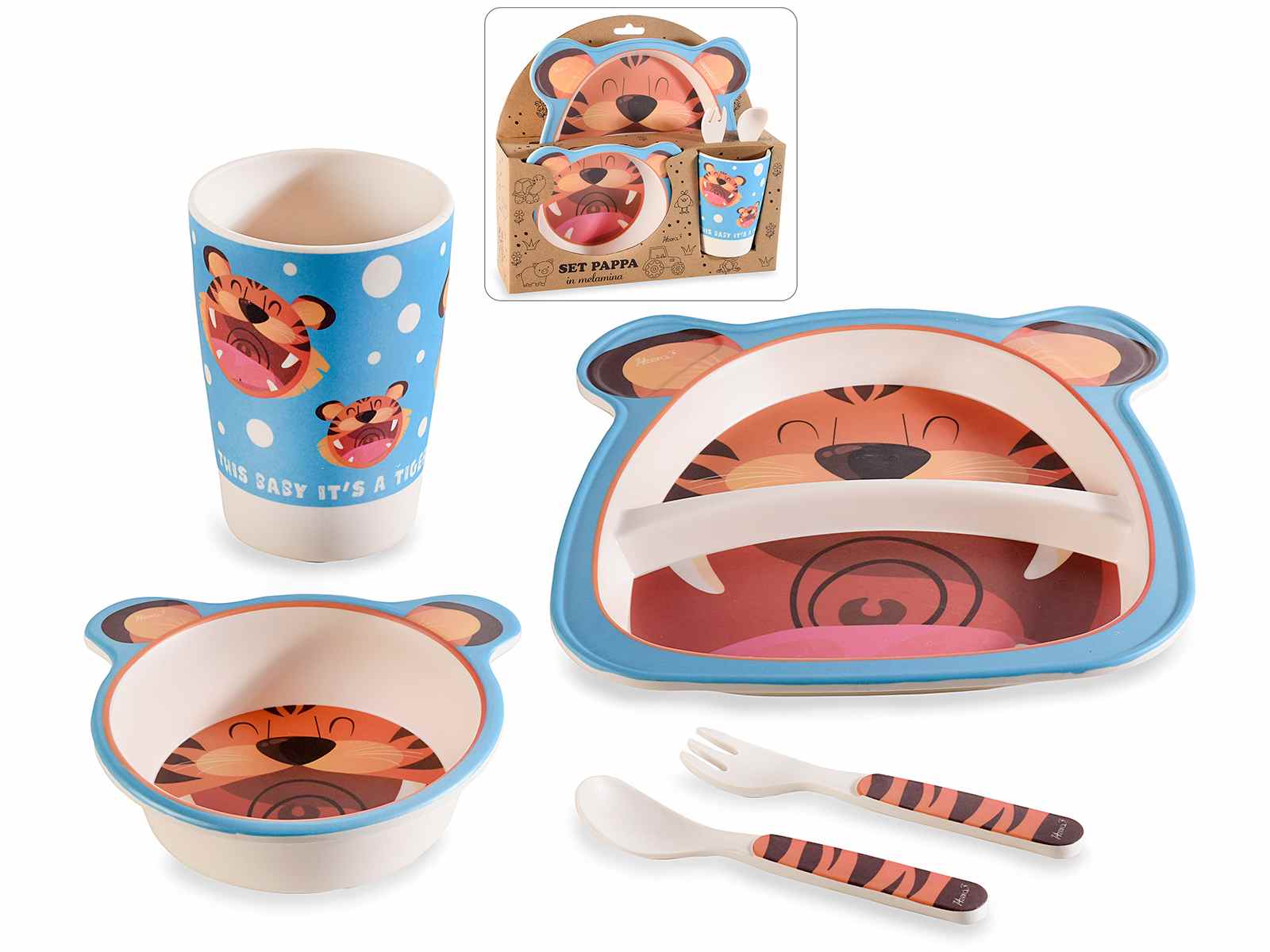 Set de comida para bebé con estampado de tigre, en melamina ligera y resistente en caja de regalo de 5 piezas: plato llano, plato hondo, vaso, 2 cubiertos