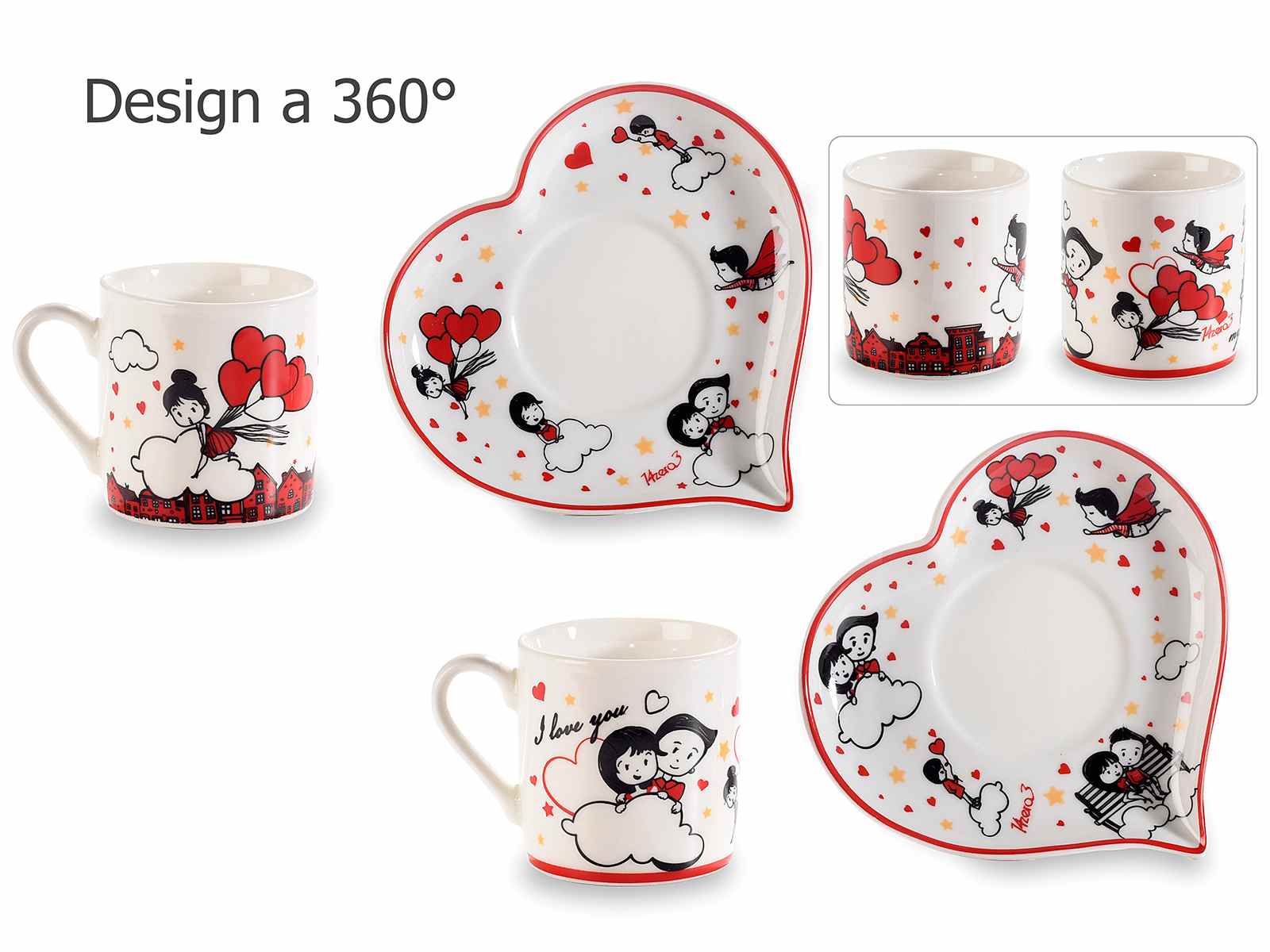 Tazas y platillos de café de porcelana para San Valentín en una caja de regalo en forma de corazón con enamorados.