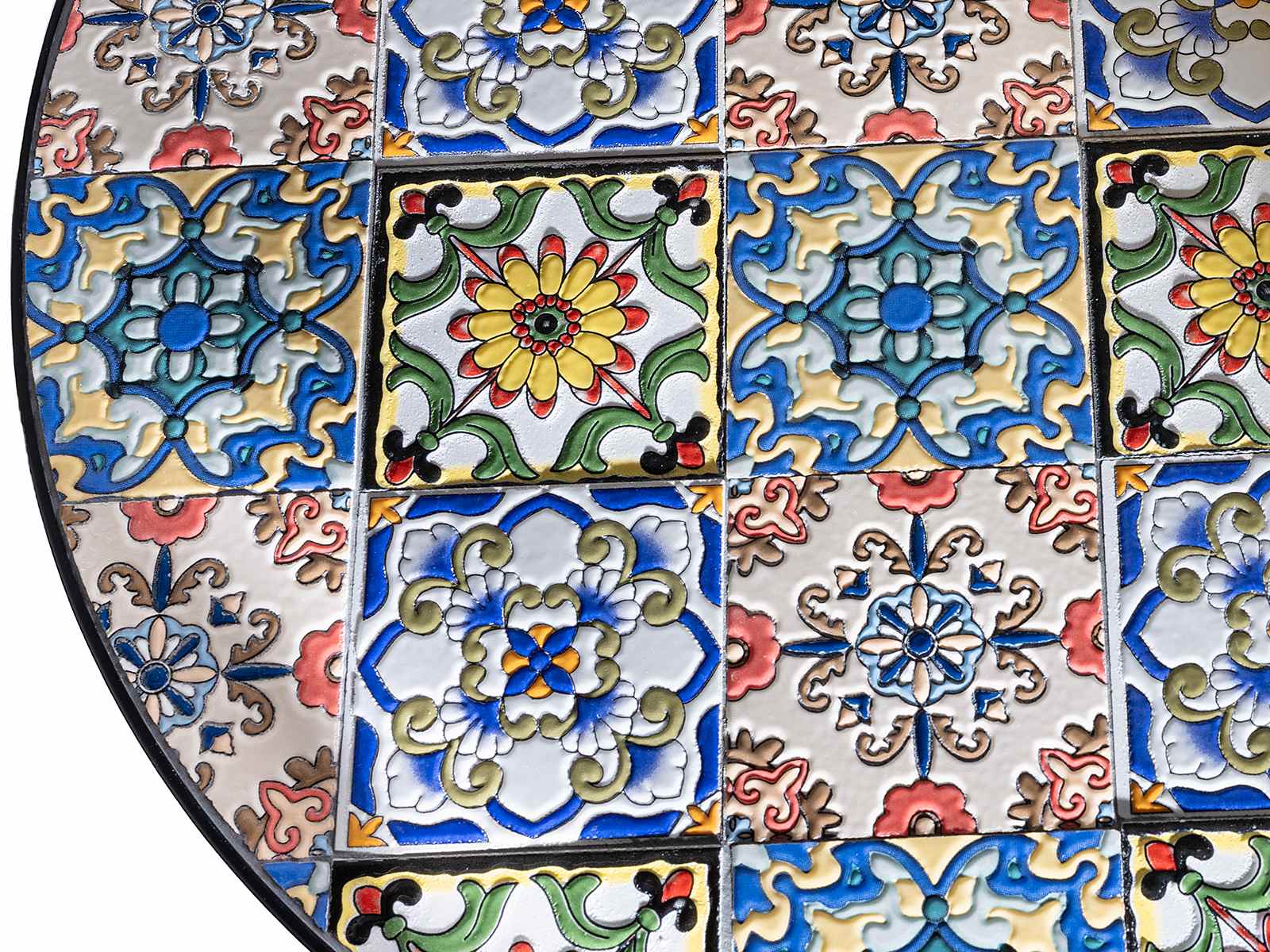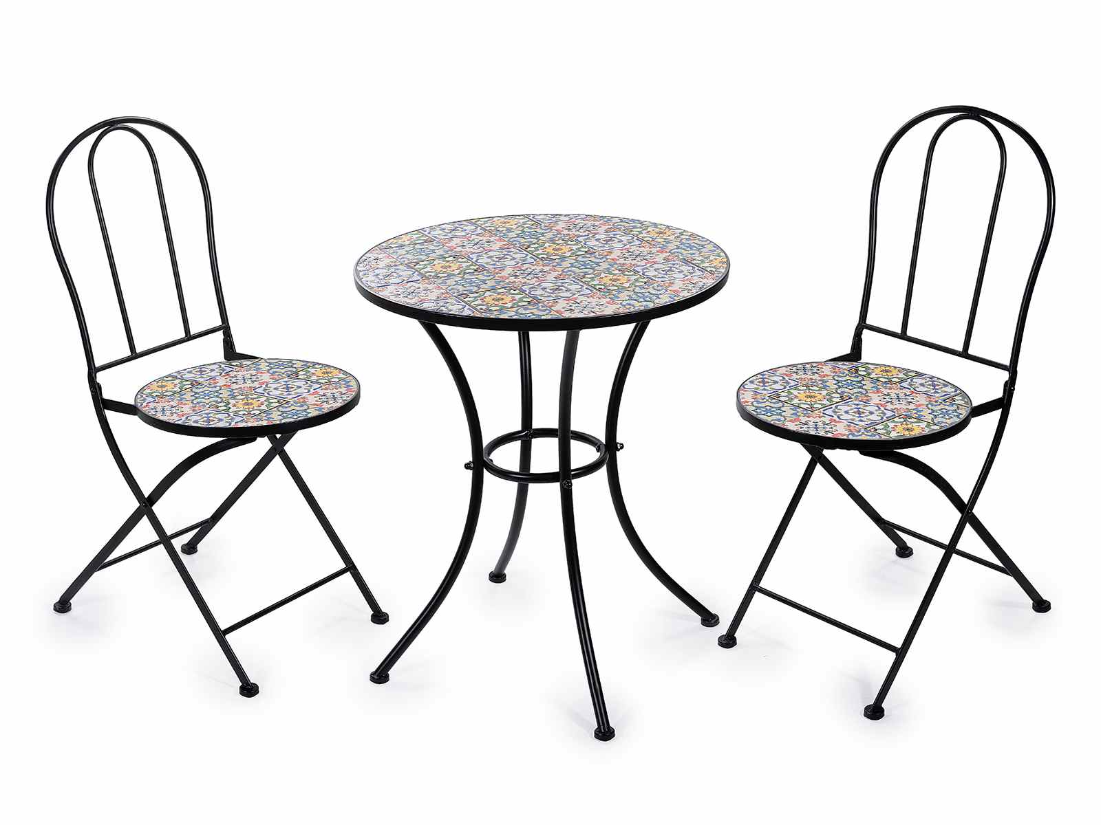 Mesa de jardín y 2 sillas en metal y mayólica cerámica decorada, ideal para ambientes exteriores, escaparates y eventos.
