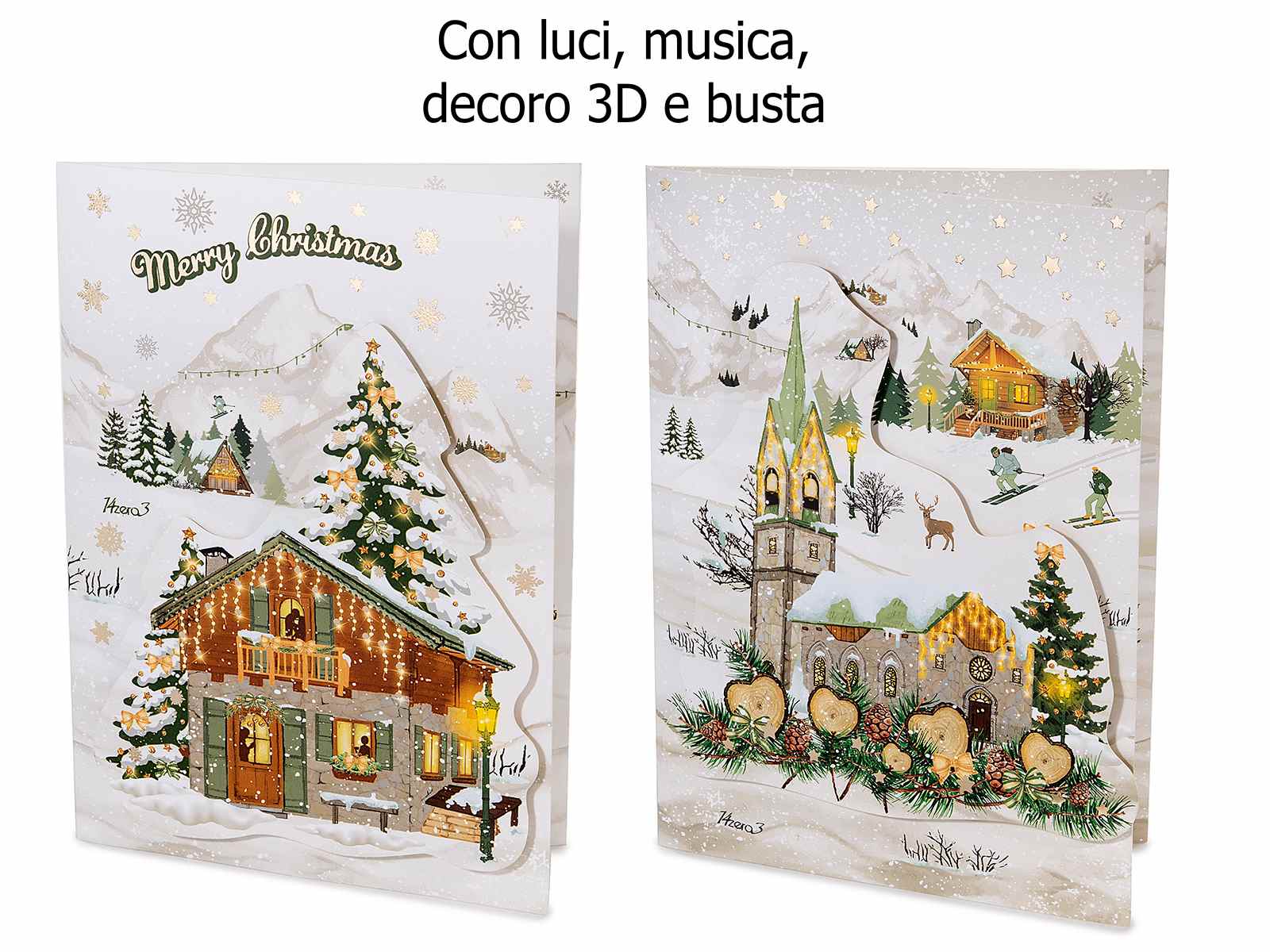 Casa de madera con capa de nieve y luces LED. |