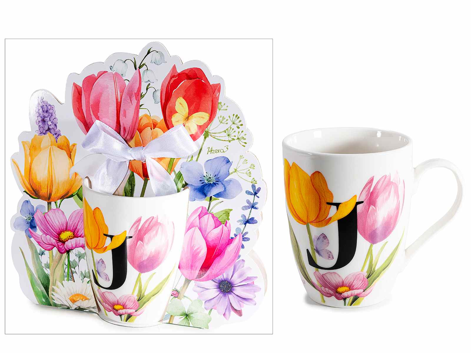 Tazas de porcelana con estampado floral y letra inicial J en una caja de regalo con forma y lazo.