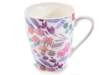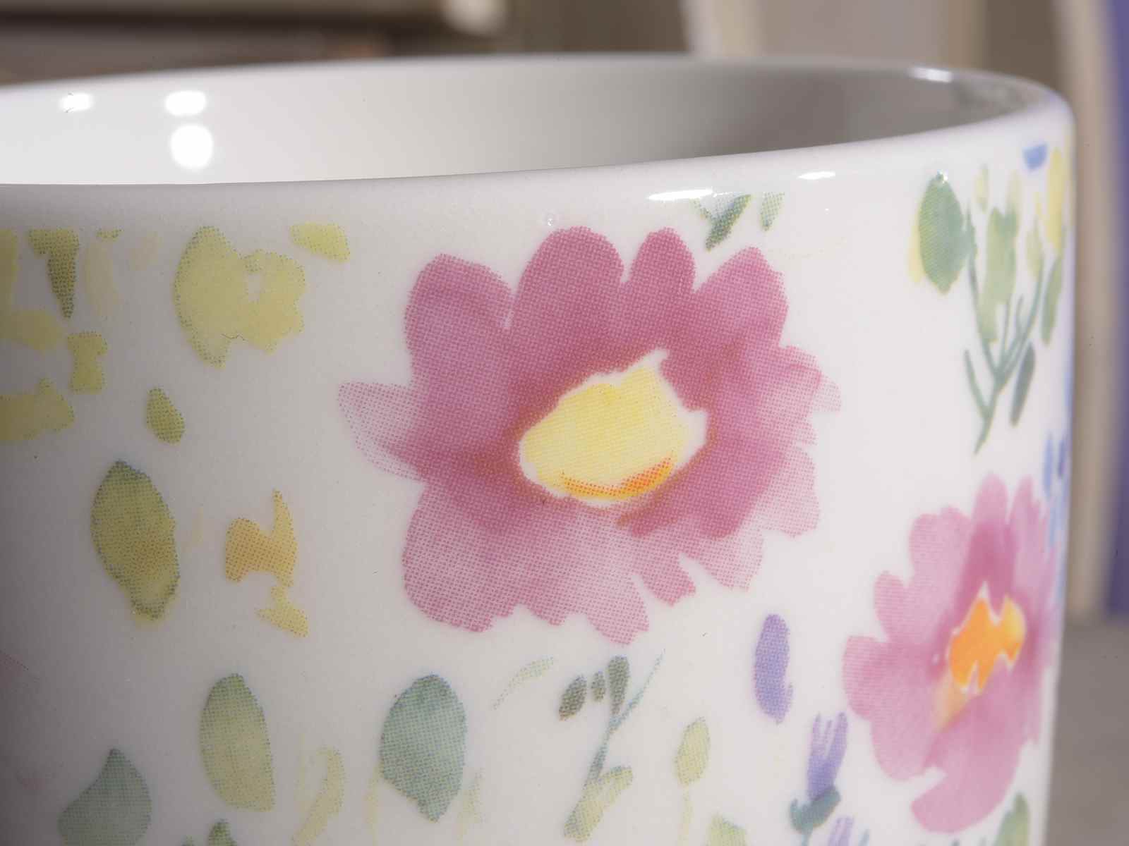 Tazas de porcelana con asa, decoraciones florales y escritura dorada.