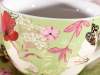 Tazas de té con platillos de porcelana de colores y decoraciones florales.