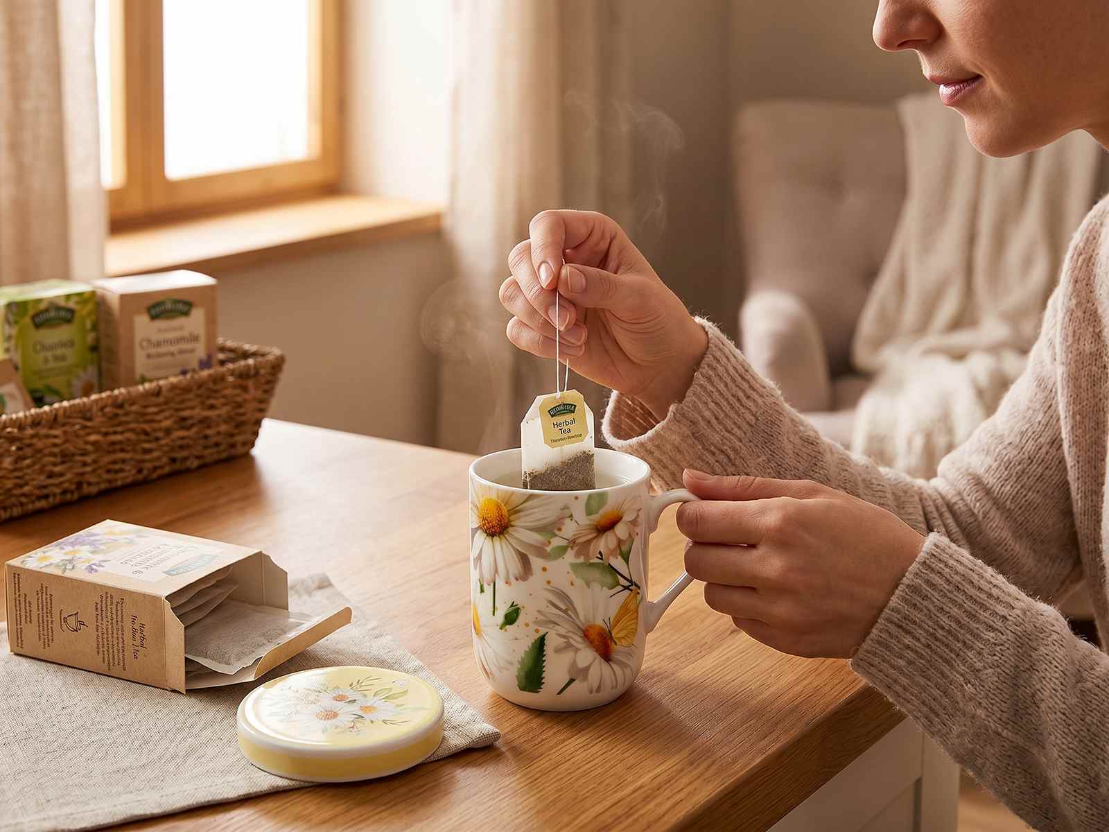 Tazas de porcelana con tapas y decoraciones de manzanilla.