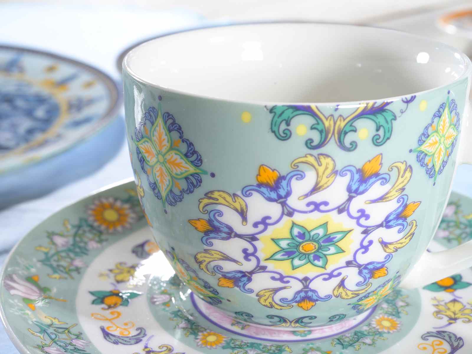 Juego de taza y tetera de porcelana con estampado mayólico |