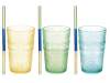 Vasos de vidrio elaborados y coloreados en tonos azules, amarillos y verdes, con pajitas ecológicas tricolores aptas para alimentos. Ideales para eventos, restaurantes y uso doméstico.