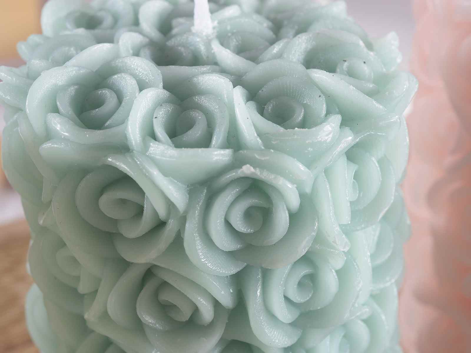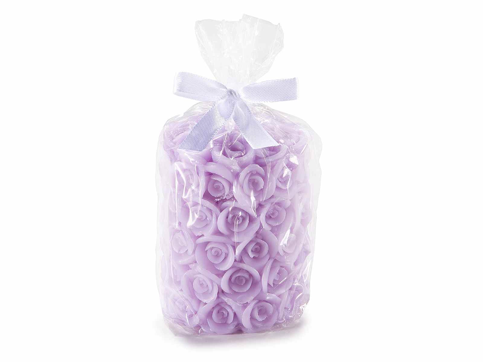 Velas de colores con superficie de rosa en relieve, en paquete individual transparente con lazo