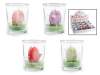 Velas con forma de tulipán en un frasco de vidrio con escritura en un expositor de 12 piezas.