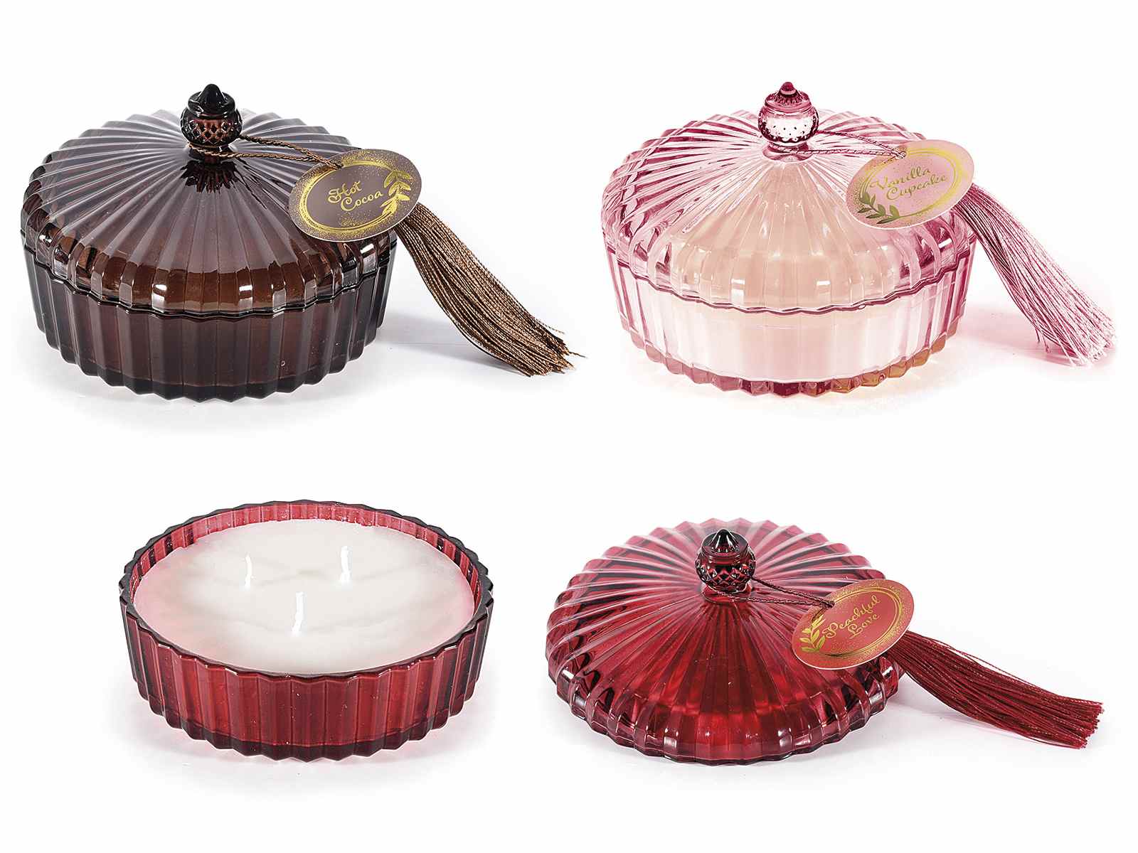 Velas perfumadas de triple llama en un frasco de vidrio hecho a mano con tapa y decoración de borlas.