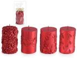 Velas rojas grandes con decoraciones en relieve en paquete individual.