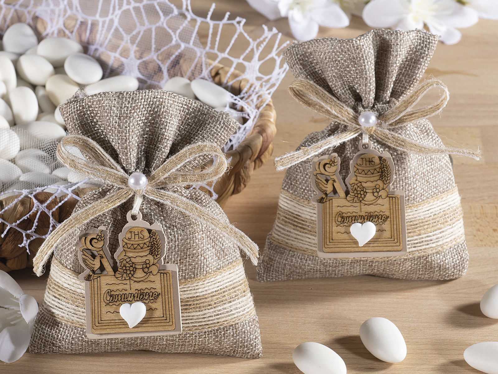90 Unid Bolsa de yute con adorno de Comunión de madera y lazo