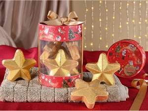 Caja de regalo navideña cilíndrica con 5 bombas de baño en forma de estrella y lazo decorativo.