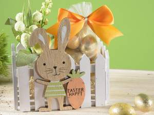 Cestas / contenedores de valla de madera con decoraciones de Pascua, huevos, zanahorias y conejitos.