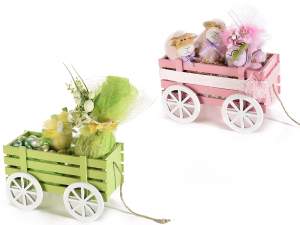 Pollitos de Pascua, huevos de colores y florecitas en un carro de madera