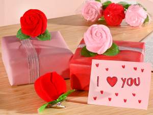 Rosas de tela rojas y rosas con cinta adhesiva de doble cara, en un expositor de 16 unidades. Ideales para decorar regalos de San Valentín y el Día de la Madre, así como para regalos de fiesta.
