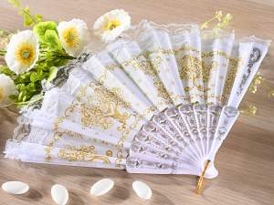 Abanicos plegables aptos para regalos de boda en plástico y tela blanca con adornos dorados del árbol de la vida
