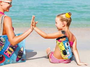 Bolsas de playa con escritura Vitamin Sea y decoraciones marinas realizadas en rafia con asas de cuerda, bolsillo interior y cierre de botón magnético.