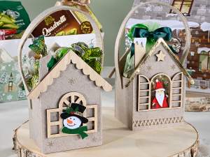 Bolsas de tela con forma de casa navideña con adornos navideños de madera cm12,5x8x15H (c/manico22). Spazio riempibile: 8,5 x 7 x 8 H