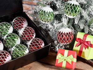 Bolas navideñas de colores en cristal moldeado con decoración de terciopelo para colgar en el árbol, en expositor de 12 piezas. Ø 6,5 cm x 12 H. Con dettagli in glitter