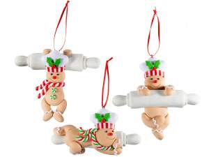 Adornos para árbol de Navidad, hombre de jengibre sobre rodillo de cocina en pasta de resina opaca y cuerda para colgar.