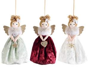 Ángeles colgantes con vestidos de terciopelo y ecopiel con alas doradas y decoración de estrellas, corazones y copos de nieve. Para colgar en el árbol de Navidad