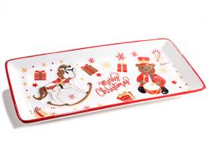 Platos navideños rectangulares en cerámica brillo, aptos para el contacto directo con alimentos con decoración de dulces.