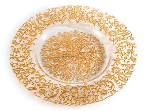 Platos redondos de vidrio aptos para contacto alimentario con decoración efecto bordado dorado.