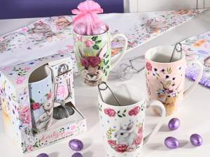 Juego de tazas de porcelana con estampado de conejito y filtro de acero, en caja de regalo.